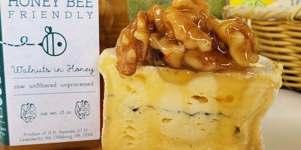 Our amazing brie with a line of Bleu in the middle. The result is a super creamy cheese with a subtle hint of blue.